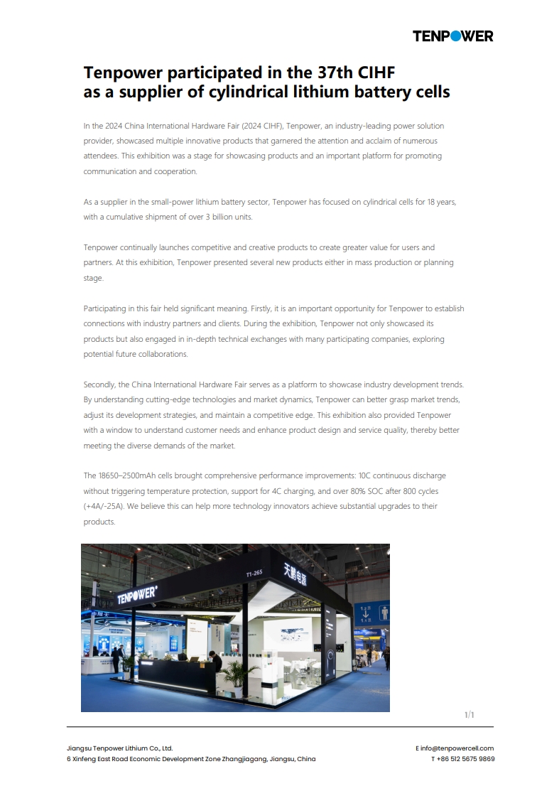 In the 2024 China International Hardware Fair (2024 CIHF), Tenpower, an industry-leading power solution provider, and a supplier of cylindrical lithium battery cells, showcased multiple innovative products that garnered the attention and acclaim of numerous attendees. This exhibition was a stage for showcasing products and an important platform for promoting communication and cooperation.